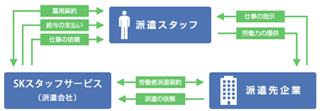 派遣会社は、お仕事のご案内、就業条件の明示、給与の支払い、福利厚生、スキルアップ研修などの面で派遣スタッフをサポートします。 派遣先企業は、派遣スタッフに対し実際の仕事にあたっての指示をします。